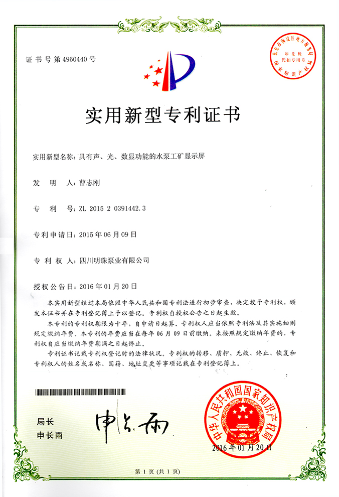 《具有声、光、数显功能的水泵工矿显示屏》实用新型专利证书