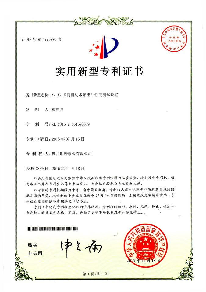 《X、Y、Z向自动水泵出厂性能测试装置》实用新型专利证书