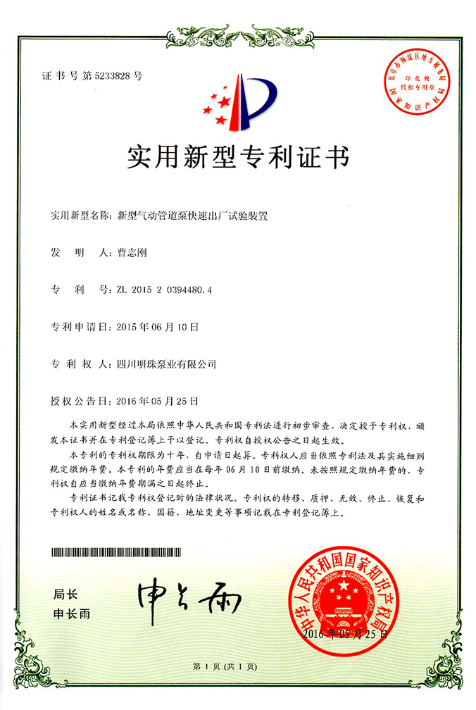 《新型气动管道泵快速出厂试验装置》实用新型专利证书