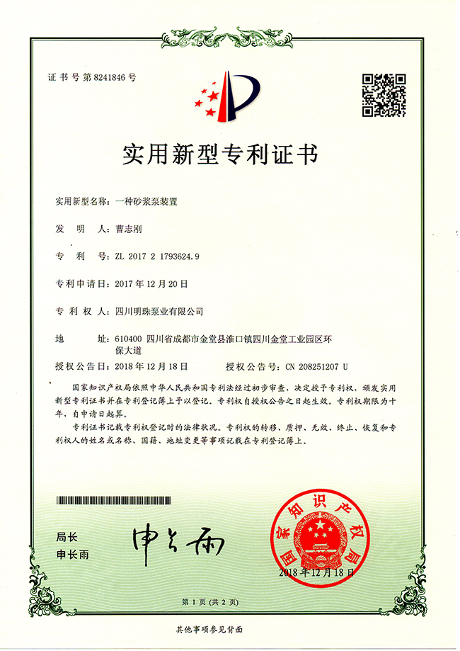 《一种砂浆泵装置》实用新型专利证书