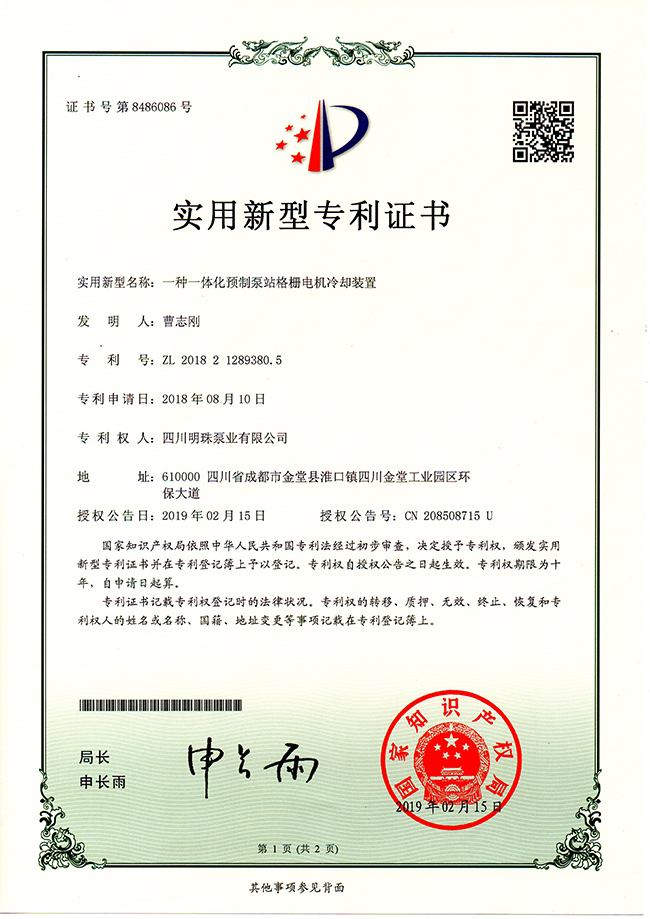 《一种一体化预制泵站格栅电机冷却装置》实用新型专利证书